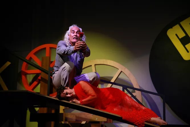 Homenageando dois célebres nomes da contemporaneidade, a montagem da Tribo de Atuadores Ói Nóis Aqui Traveiz – que completa 41 anos de fecunda trajetória – é uma livre adaptação de “Variaciones Meyerhold”, do dramaturgo, ator e psicanalista argentino Eduardo Pavlovsky. No centro da ação está o célebre ator, diretor e teórico russo Meierhold, cujo discurso inovador e revolucionário o transformou em um dos maiores pensadores do teatro mundial. A encenação é estruturada em fragmentos e alterna a ação entre pensamentos em voz alta e diálogos imaginários, lançando mão de diversas linguagens e recursos cênicos, num tom surrealista e com cenografia construtivista, falando de teatro e revolução, o que cai como uma luva no momento atual.