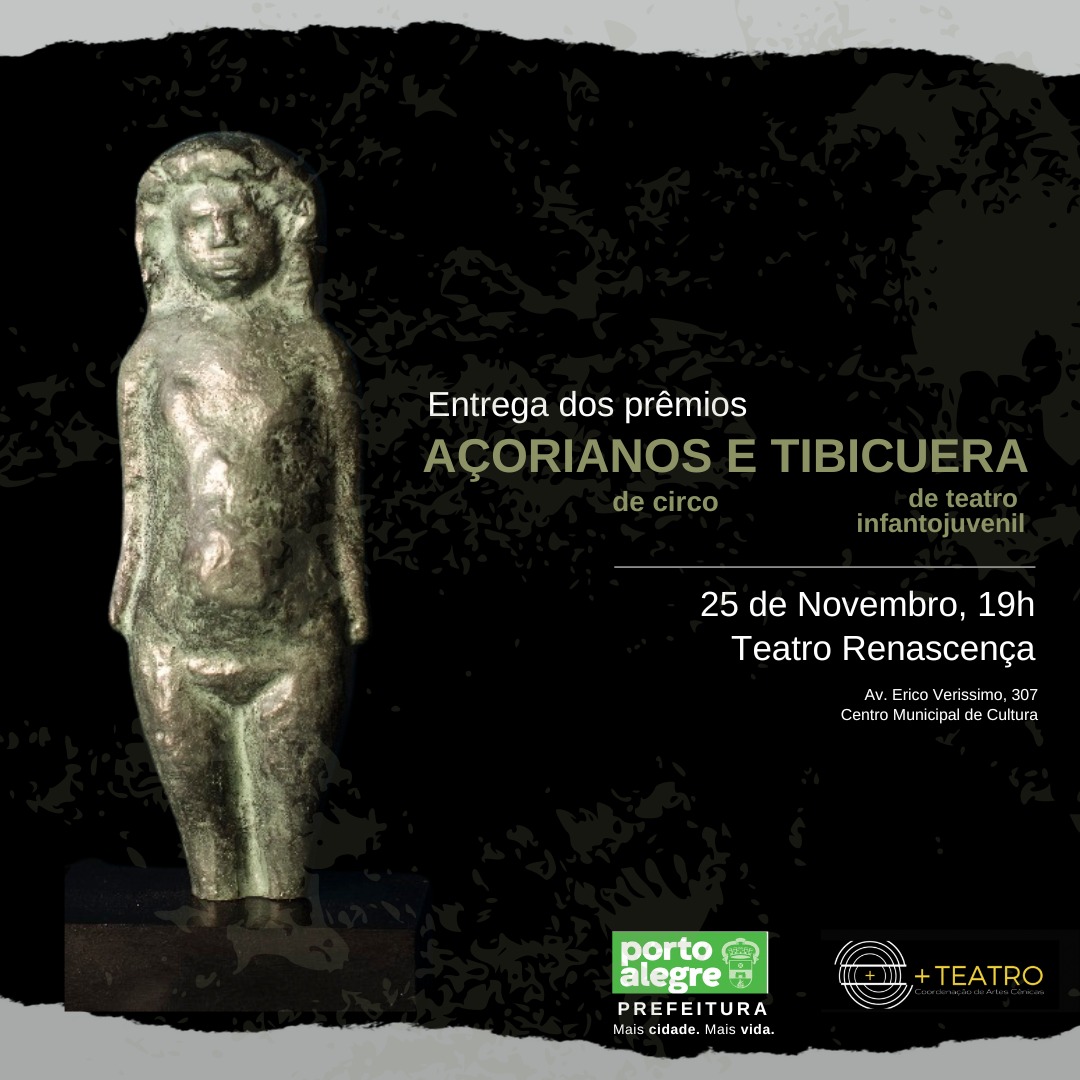 A Coordenação de Artes Cênicas de Porto Alegre convida a comunidade artística para participar da cerimônia de entrega dos Prêmios Açorianos de Circo e Tibicuera de Teatro Infanto-juvenil, na sexta-feira, dia 25 de novembro às 19:00, no Teatro Renascença.