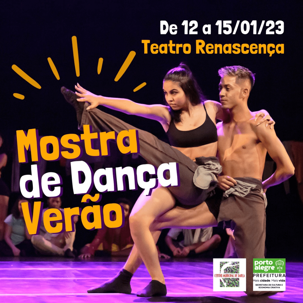 O Centro de Dança da Secretaria Municipal de Cultura e Economia Criativa da Prefeitura de Porto Alegre realiza a Mostra de Dança Verão 2023 que acontecerá de 12 a 15 de janeiro de 2023, no Teatro Renascença, às 20h, com o objetivo de difundir a produção de dança de Porto Alegre.