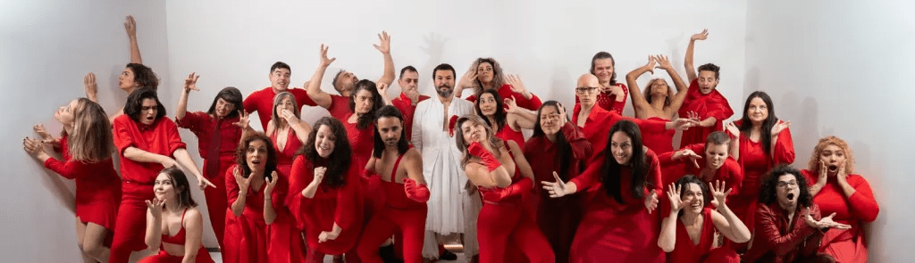 A performance acontece com mais de 20 artistas de diversas áreas, intercalados em cenas fragmentadas. Representa, por meio da encenação coletiva, uma metáfora de vivermos entre nós, de estarmos entre os outros.