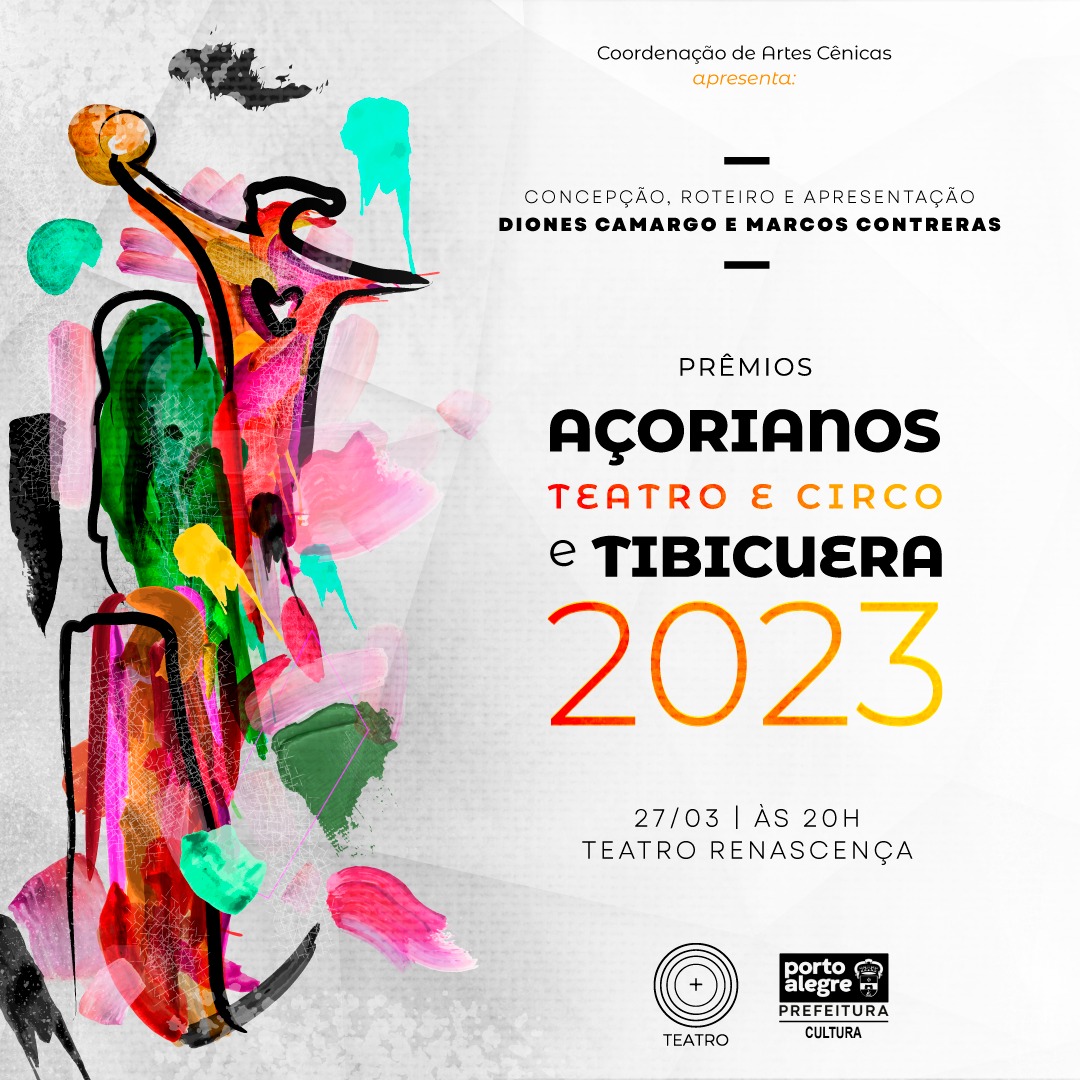 No Teatro Renascença, dia 27 de março, às 20h, a Coordenação de Artes Cênicas, da Secretaria Municipal da Cultura e Economia Criativa convida para a cerimônia de entrega dos Prêmios Açorianos e Tibicuera de 2023.