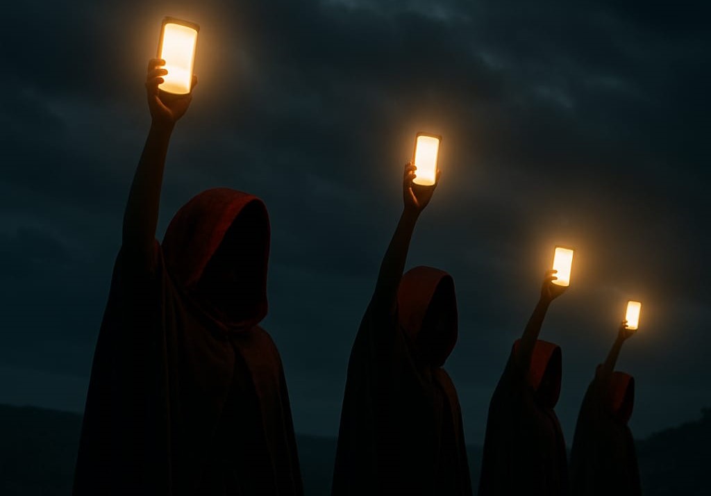 A obra traça um paralelo entre a fogueira da Inquisição, que queimava ideias e corpos considerados inaceitáveis, e a atual “inquisição digital”, alimentada por discursos de ódio, cultura do cancelamento, linchamentos virtuais e fake news. Nesse contexto, a tecnologia é protagonista, especialmente o celular, que hoje atua quase como um novo apêndice humano. Já não saímos de casa sem ele, e nele buscamos informações, muitas vezes provenientes de fontes duvidosas como as redes sociais. Ele nos conecta e nos controla. É ao mesmo tempo oráculo e arma.