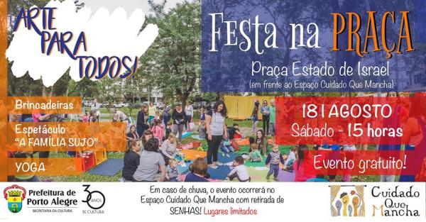 EVENTO GRATUITO Sábado, 18 de agosto, às 15h Praça Estado de Israel (Em frente ao Espaço Cuidado Que Mancha) Mais uma edição da FESTA NA PRAÇA promovida pelo Projeto Arte Para Todos do Grupo Cuidado Que Mancha, que foi contemplado pelo programa municipal de fomento ao trabalho continuado em artes cênicas. > Sobre o... Continuar Lendo →