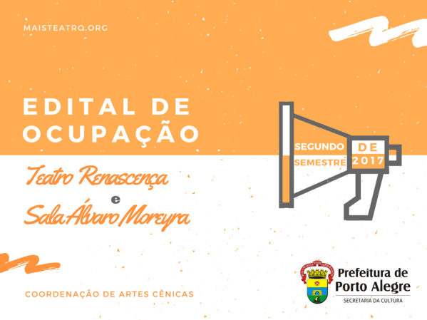 A Coordenação de Artes Cênicas da Secretaria da Cultura de Porto Alegre recebe no período de 15 a 26 de maio de 2017, pedidos para ocupação do Teatro Renascença e da Sala Álvaro Moreyra. As datas oferecidas são para o 2° semestre do ano de 2017, com temporadas de TEATRO E CIRCO, ESPETÁCULOS PARA PÚBLICO INFANTOJUVENIL, DANÇA, MÚSICA, PROJETOS... Continuar Lendo →