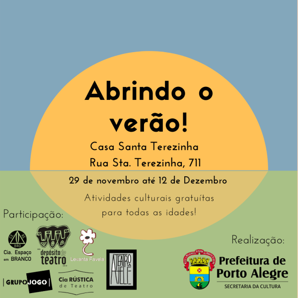 O Projeto Abrindo Verão traz espetáculos teatrais, oficinas e conversas educativas de maneira totalmente gratuita para a comunidade da Vila Planetário. As atividades acontecem entre os dias 29 de novembro e 13 de dezembro, na Casa das Artes Santa Terezinha, da Secretaria Municipal da Cultura de Porto Alegre. Com programação ampla para adultos, jovens e... Continuar Lendo →