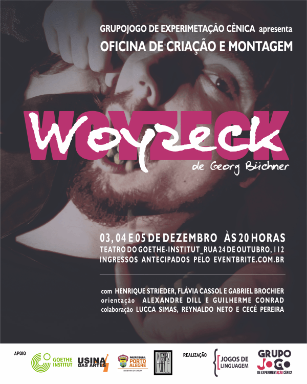 GRUPOJOGO APRESENTA WOYZECK NO TEATRO DO INSTITUTO GOETHE Woyzeck de Georg Büchner » Teatro do Goethe-Institut Porto Alegre (Rua 24 de Outubro, 112) » 03,04,05 de dezembro às 20 horas » Ingressos: R$ 20 inteira e R$ 10 meia entrada. Antecipados aqui Espetáculo de Conclusão da Oficina de Criação e Montagem do GRUPOJOGO. » A... Continuar Lendo →